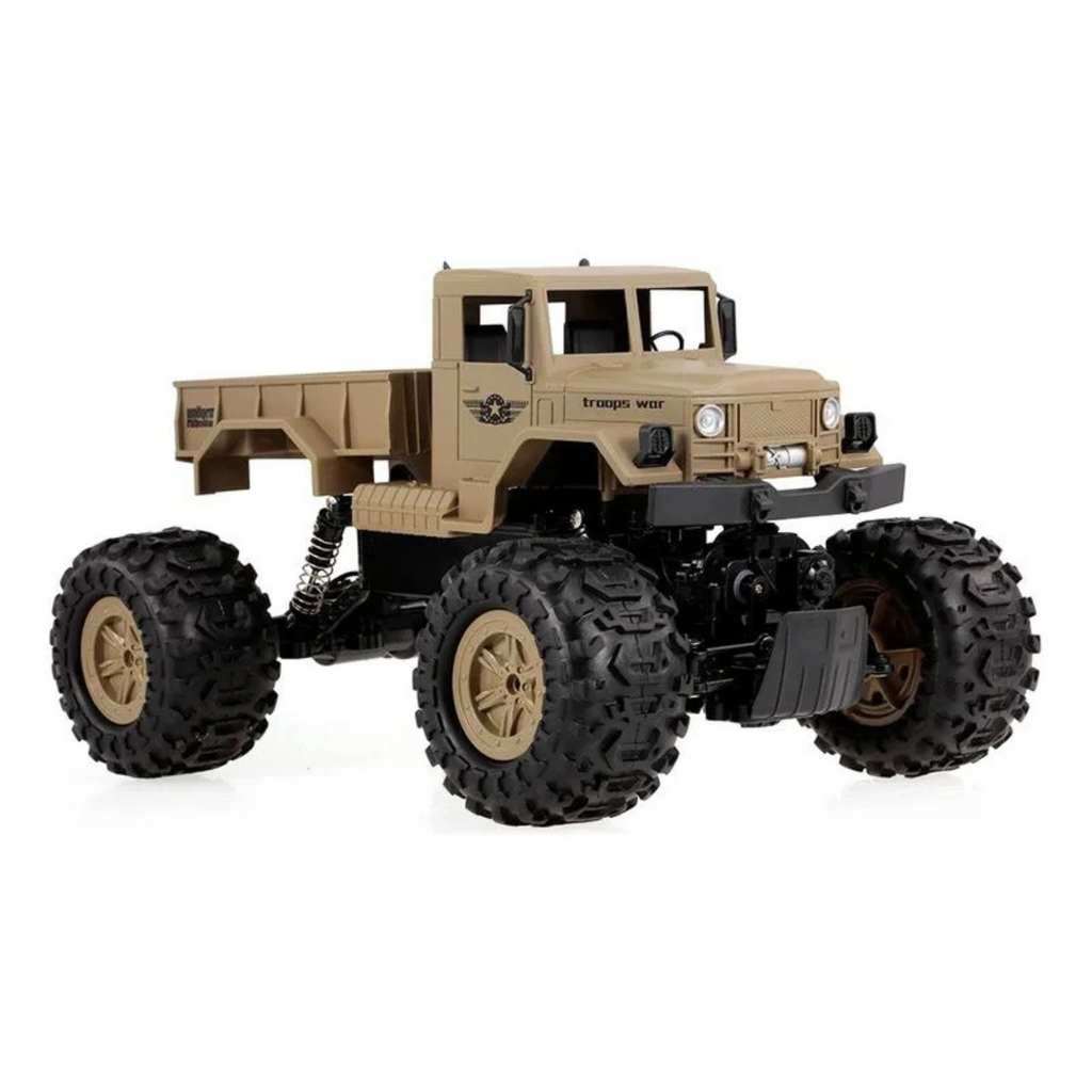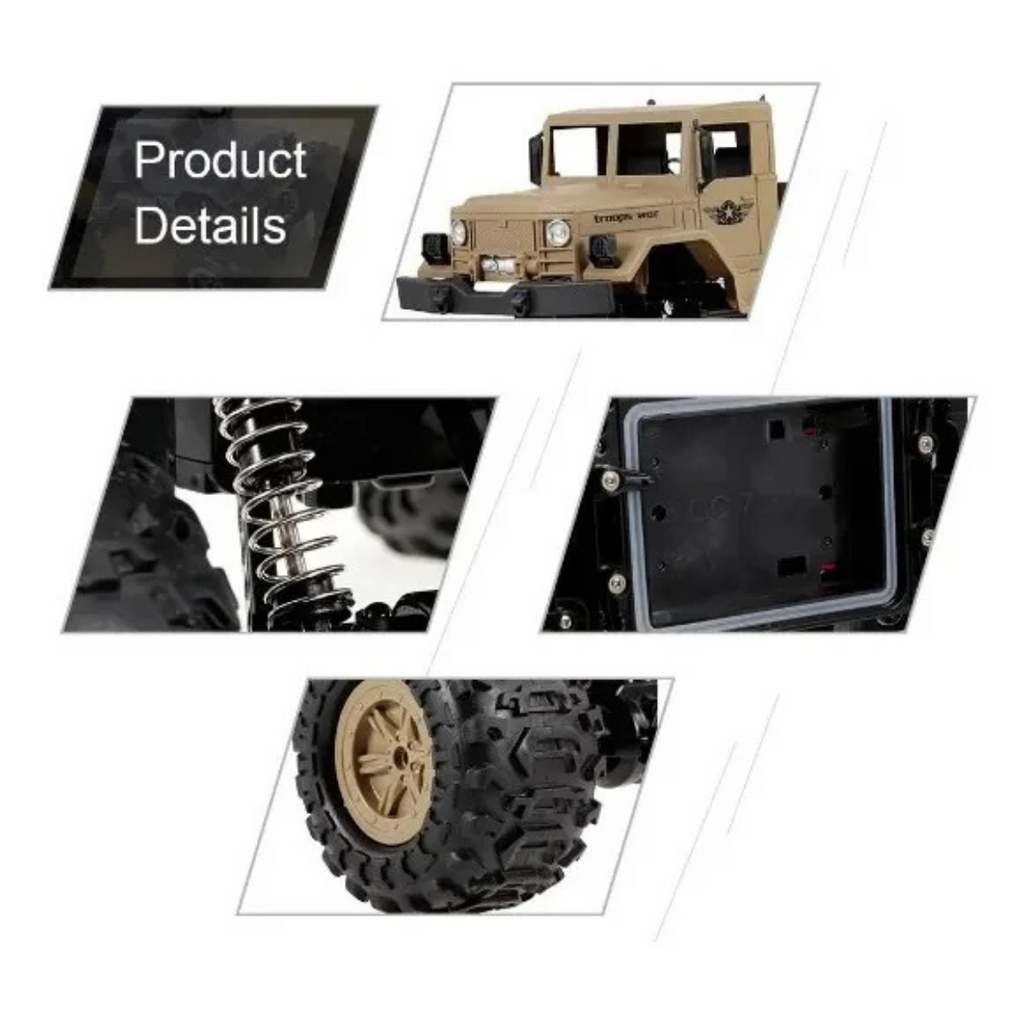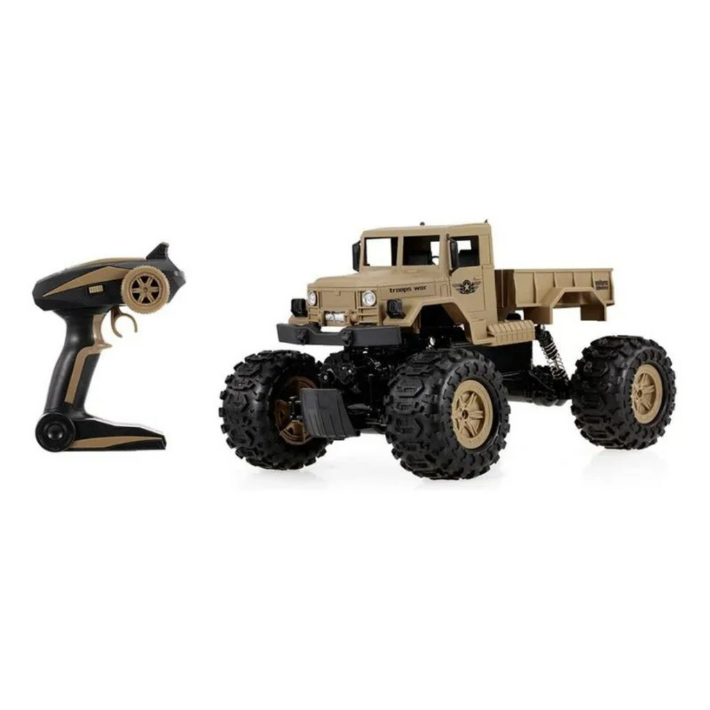 ¿Estás listo? Una Camioneta Militar a control remoto genial. Presenta una proporción completa a escala 1/12 y un diseño único de coche de tropas, ofreciendo a sus hijos una experiencia de conducción real y emocionante. Con sus cuatro ruedas de oruga de diseño especial y sistema de suspensión independiente, este coche puede circular en la nieve, la arena y la roca sin problemas, lo que le proporciona un rendimiento de funcionamiento estable. Además, está equipado con un sistema de control remoto súper de 2,4G, el rango de control máximo puede ser de hasta 50 metros. Características: Funciones: adelante, atrás, girar a la izquierda, girar a la derecha, sistema de accionamiento 4WD, control remoto 2,4G, rango remoto de 50m, antichoque, todoterreno Con motor de doble alta resistencia y rueda en forma de oruga, este coche de roca puede circular en varias condiciones de carretera, dándote una sensación heroica. El sistema de suspensión independiente de cuatro ruedas y los amortiguadores garantizan una práctica de conducción estable. 2,4 GHz admite un rango de control remoto de unos 50 metros y proporciona una buena capacidad antiinterferencia, jugando con tus amigos simultáneamente. Un diseño genial de camión militar y escala 1/12 hace que el coche sea más atractivo, un gran regalo para niños. Con una batería recargable de gran capacidad, el tiempo de funcionamiento puede llegar hasta unos 20 minutos. Incluye 1 bateria recargable de 7.2v El radio control requiere 3 pilas AA (No incluidas) Edad 5+. Los precios de éste sitio web son exclusivos para compras online y no necesariamente coinciden con los precios en el local.