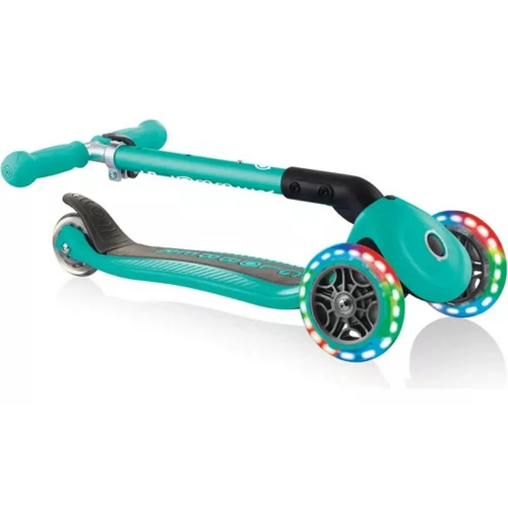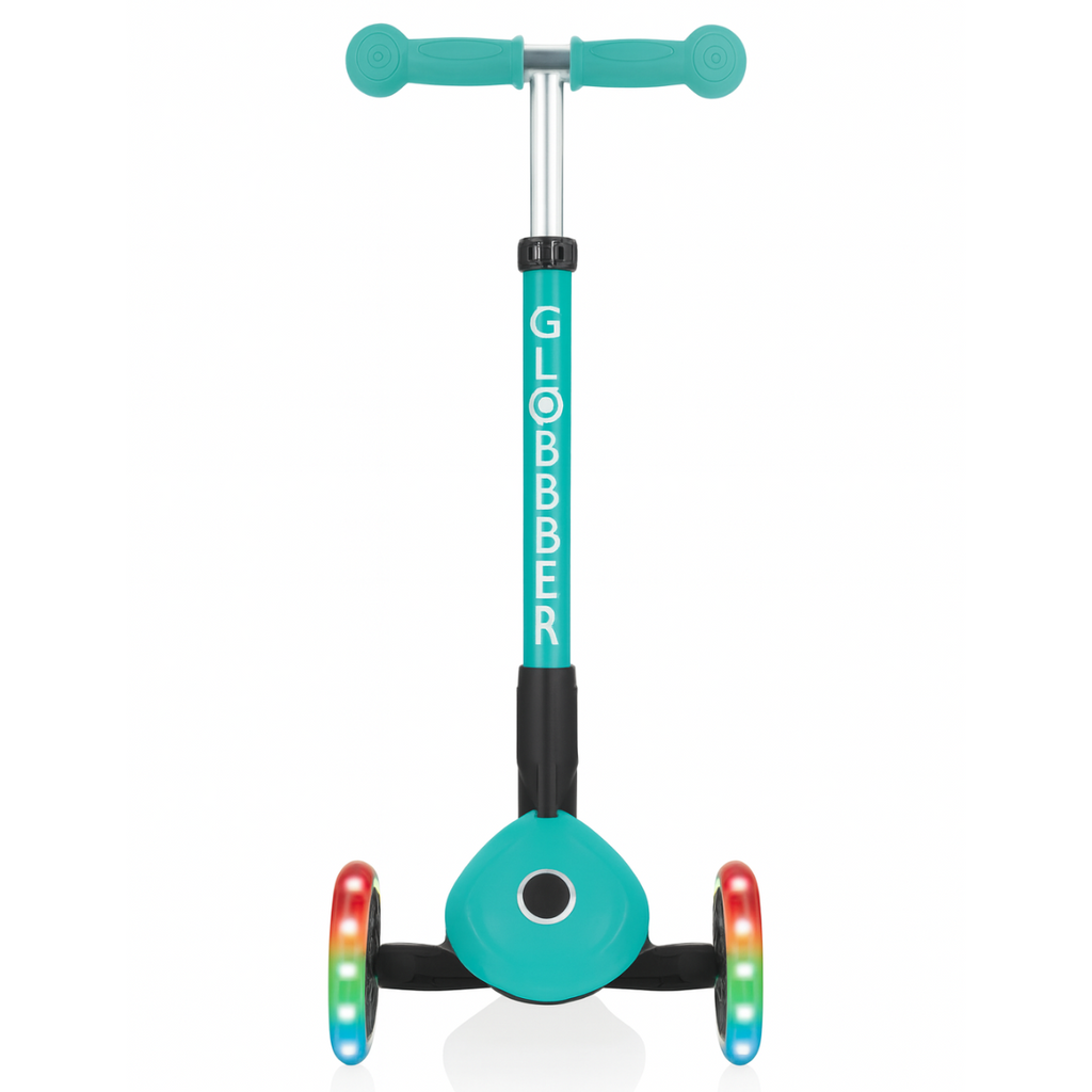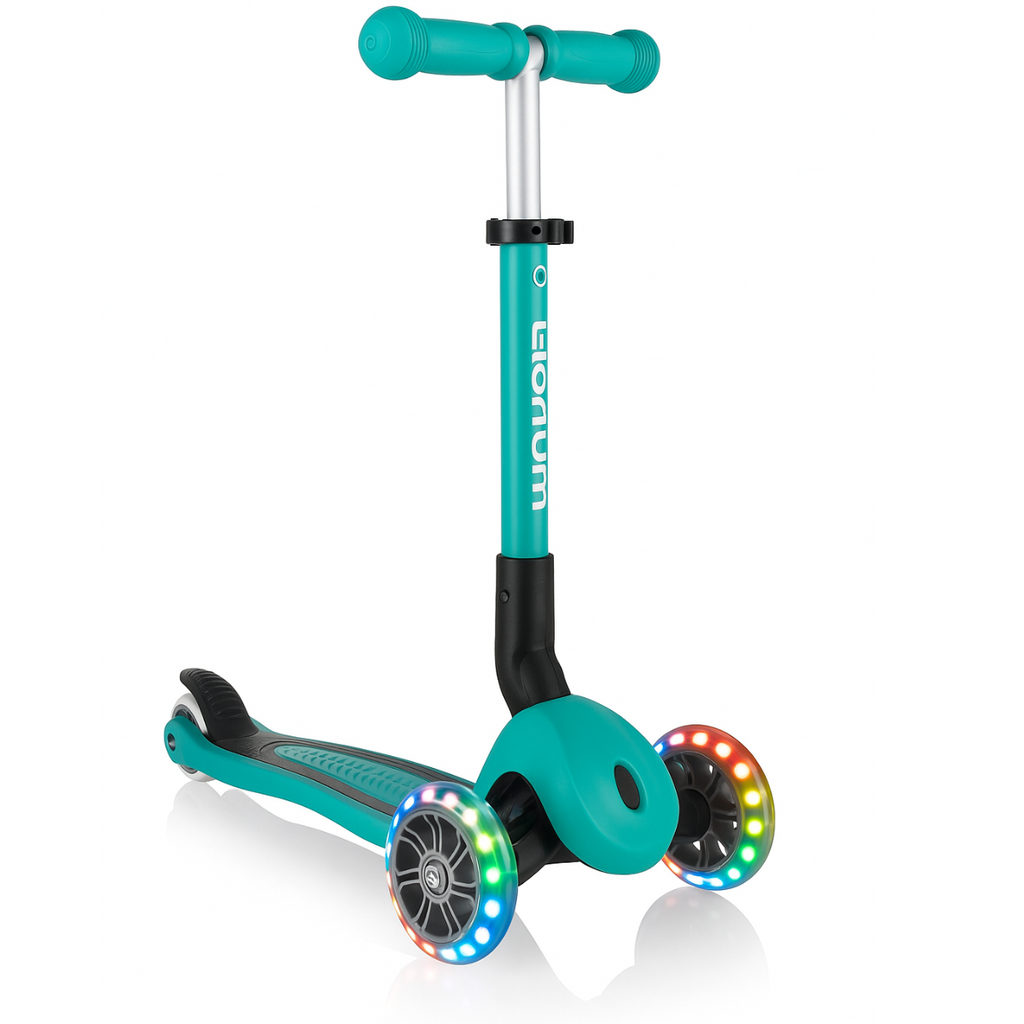 Globber Monoptin Junior Plegable y c/Luces Turquesa 437-107 Edad: a partir de 24 meses Monopatín de alta calidad con 3 ruedas y mecanismo de plegado patentado Modo trolley para facilitar el transporte Ruedas moldeadas de PU, ruedas delanteras de 120 mm, rueda trasera de 80 mm, gran rebote, rodamientos de bolas ABEC 5 Ruedas delanteras con rodillos de luz LED sin batería (tecnología dinamo) Freno de fricción optimizado y extra ancho en la rueda trasera con protección de radios Bloqueo de dirección patentado activable, puños ergonómicos de TPR Manillar de aluminio anodizado en color, regulable en altura en 3 posiciones 54-68 cm, incl. cierre rápido y bloqueo de seguridad Cubierta reforzada extra profunda con superficie antideslizante de 2 colores Peso máximo del usuario: 50 kg.