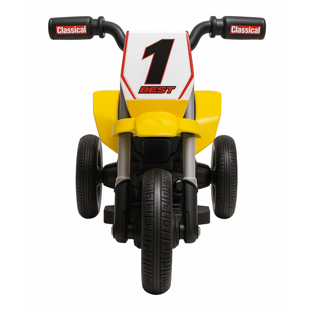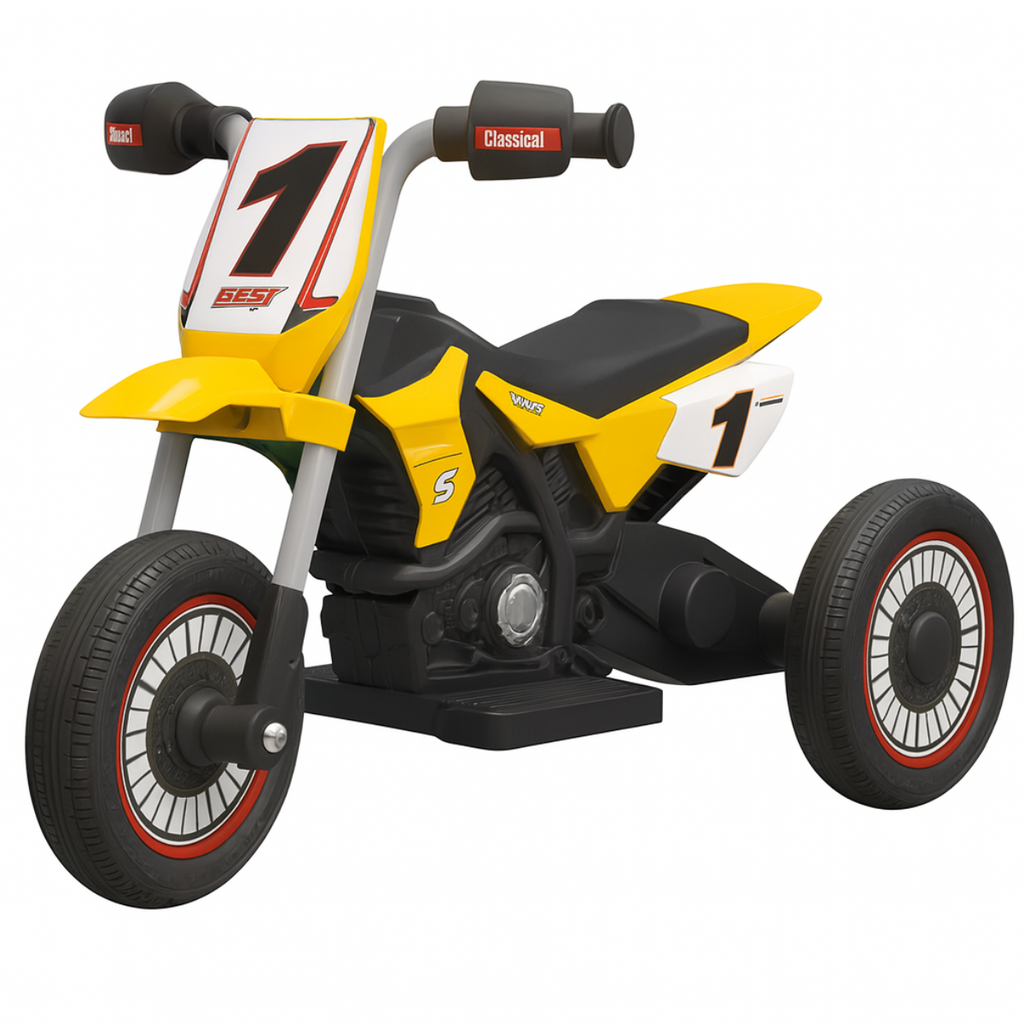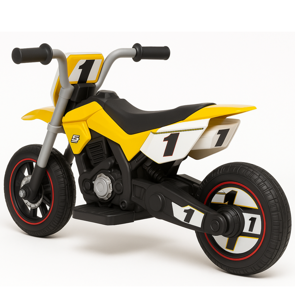MOTO ENDURO 6V GVC-5478. Motor de 6V. Luces delanteras. Sonidos. Ruedas de seguridad. Edad recomendada de 12 a 36 meses. 1 batería 6V - 4 Ah. 1 motor de 15 W. Función inversa. Dimensiones: 71 x 45 x 51 cm.