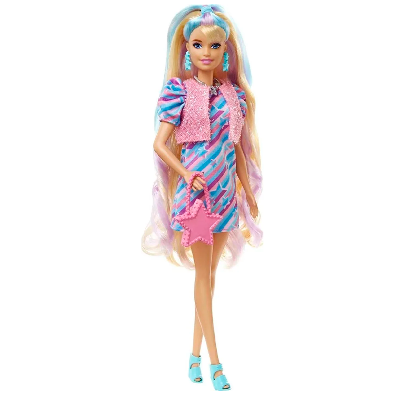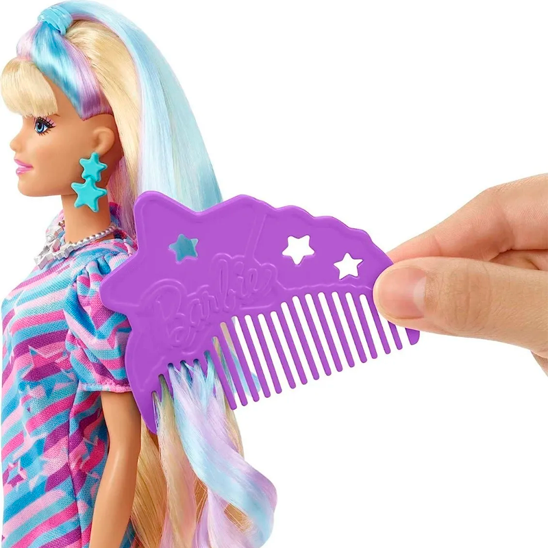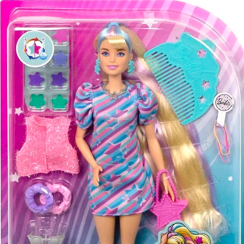 La muñeca Barbie Totally Hair con temática de estrellas luce su propio peinado, textura de cabello y aspecto de moda y está inspirada en la muñeca más vendida que debutó por primera vez hace 30 años Barbie La muñeca tiene 8.5 pulgadas de pelo extralargo y viene con más de 15 piezas adicionales: 8 son pinzas de pelo que cambian de color, un peine, 1 juego de lazos para el pelo, 2 coleteros, moda de chaleco metálico, bolso, gafas de sol y un collar. Los clips de cambio de color vienen en 4 colores diferentes y cambiarán de color con el calor de los dedos, los niños se divertirán con todas las posibilidades de estilo Con una forma original del cuerpo, la muñeca con temática de estrellas viene con flequillo lateral como un guiño a la muñeca original Barbie Totally Hair Plus tiene hermosos reflejos morados y azules. Su vestido cuenta con un estampado de estrellas con detalle de manga abombada.. Los precios de éste sitio web son exclusivos para compras online y no necesariamente coinciden con los precios en el local.
